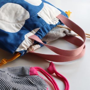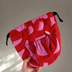 The ENCIRCLE Pouch construction is straightforward but a little unusual – the trickiest element in making the ENCIRCLE Pouch is handling the curve of the front and back circles, the mini size being the trickiest. The drawstring closure is a lovely and easy closure technique to learn and the pattern also includes and elasticated and a slip pocket. The lining and outer bags are made with the same construction, with pocket options that can be used internally and externally.
