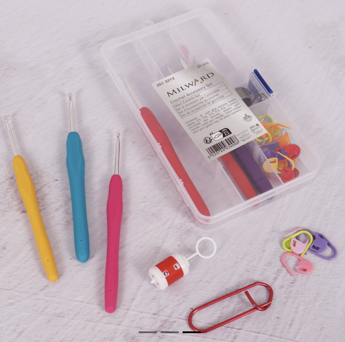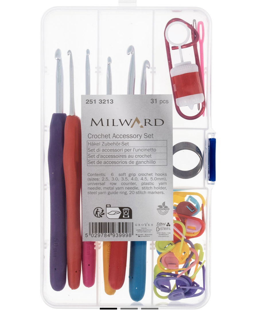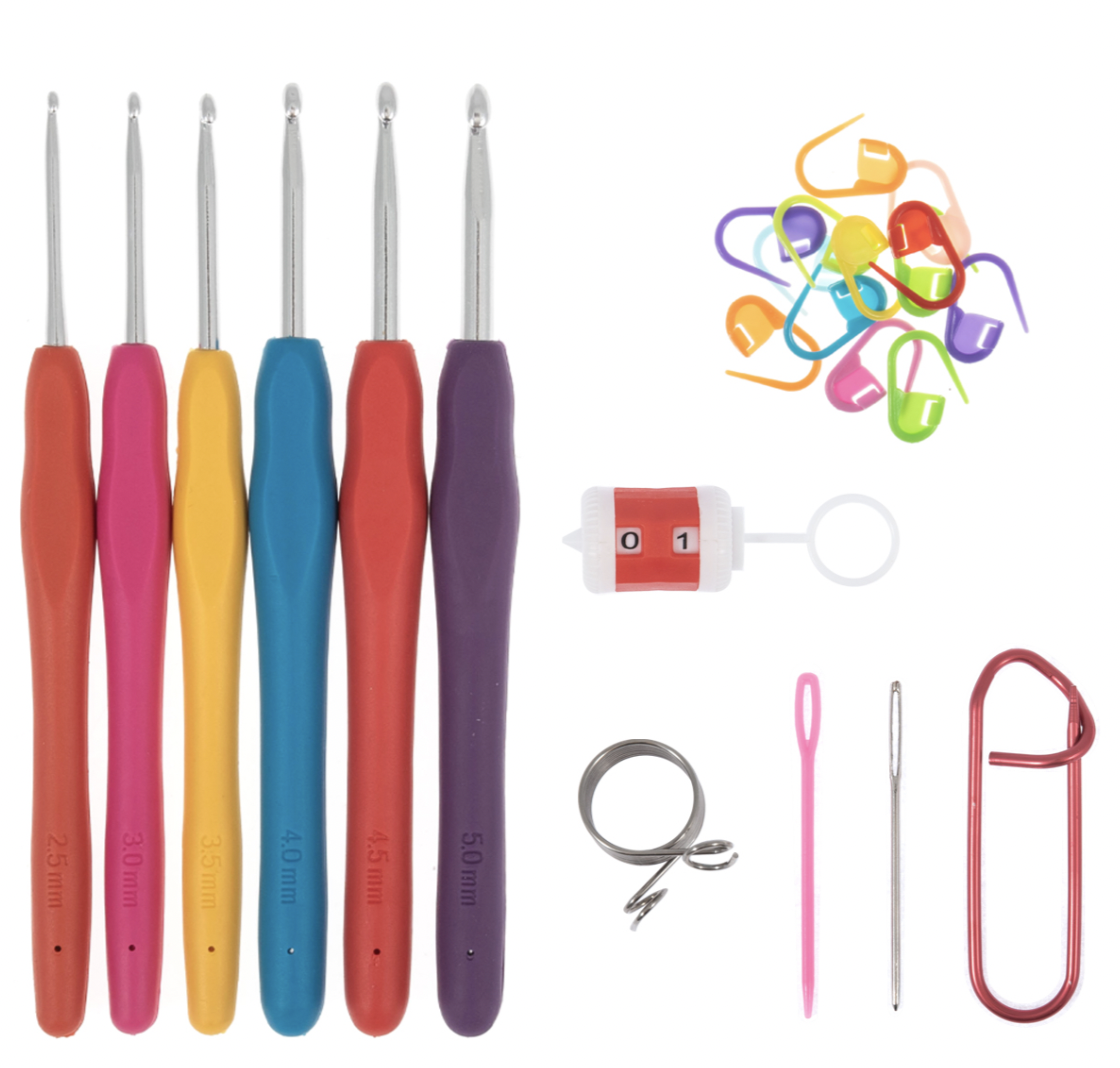- Each box contains: 6 soft grip crochet hooks (sizes: 2.5, 3.0, 3.5, 4.0, 4.5, 5.0mm); 1 universal row counter; 1 plastic yarn needle; 1 metal yarn needle; 1 stitch holder; 1 steel yarn guide ring and 20 stitch markers.