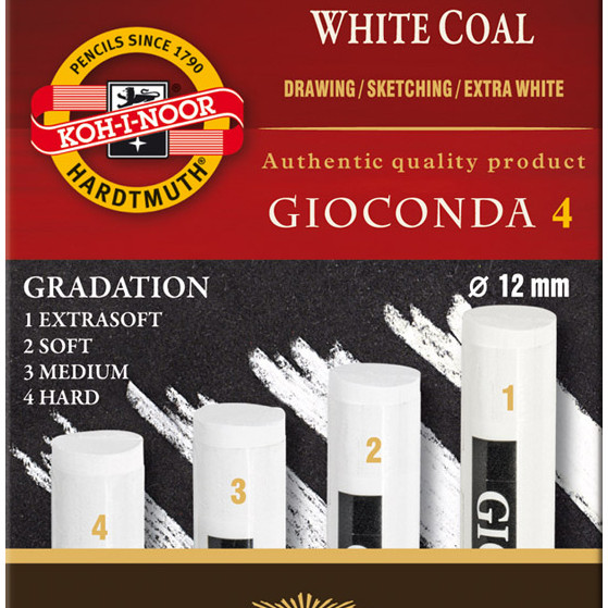 Koh-I-Noor Gioconda White Coal is the counterpart of the Koh-I-Noor Gioconda Extra Charcoal. It delivers an exceptionally bright and velvety soft white, allowing artists to achieve intense and dramatic contrasts in their artwork. It’s the perfect choice for those seeking to create rich, light tones and smooth, luxurious textures on a dark-toned surface.