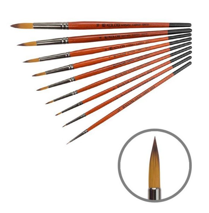 Synthetic Round Brush Carrot features synthetic, elastic, and resilient bristles that imitate natural kolinsky hair. These universal brushes are suitable for a wide range of tasks—from stamping and painting to working with watercolour, gouache, and acrylic. The sharp-tipped round brush, securely fixed in a chrome-plated ferrule, allows for varying stroke widths depending on the pressure applied. The shortened, lacquered handle fits comfortably in the hand and is resistant to moisture.