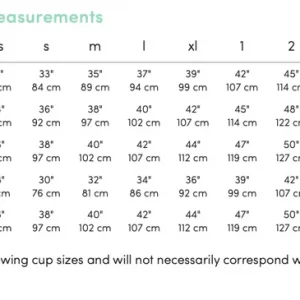 Sizing: XXS – XL and plus sizes 1 – 5 with A/B and C/D cups (approx. UK 6/8 – 30/32)