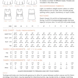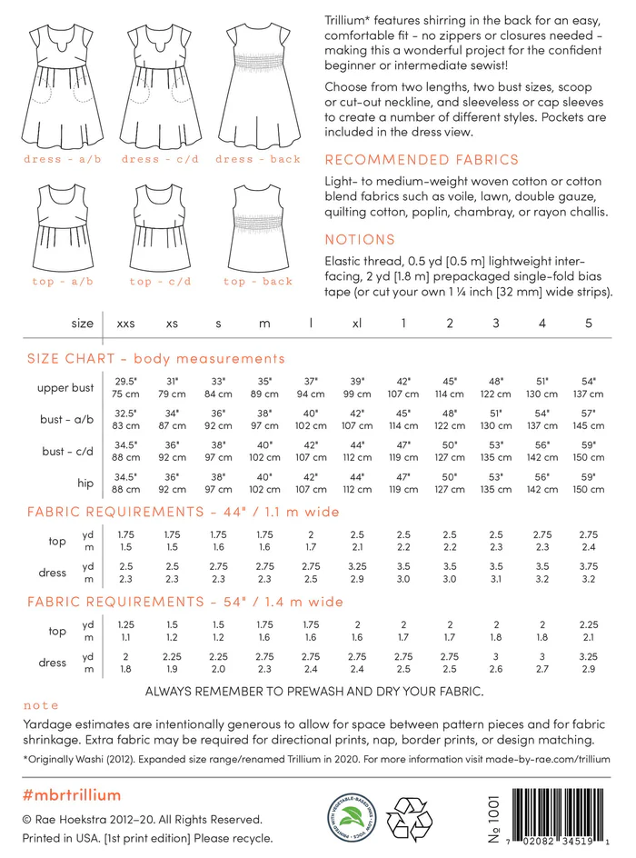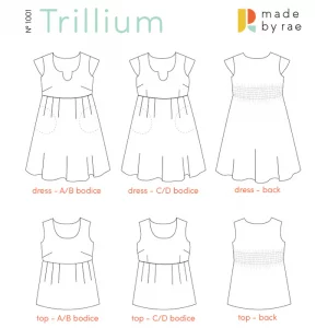 Trillium features shirring in the back for an easy, comfortable fit. No zippers or closures are needed, making this a wonderful project for the confident beginner or intermediate sewist. Choose from two lengths (dress or top), two bust sizes, scoop or cut-out neckline, and sleeveless or cap sleeves to create a number of different styles. Pockets are included in the dress view.